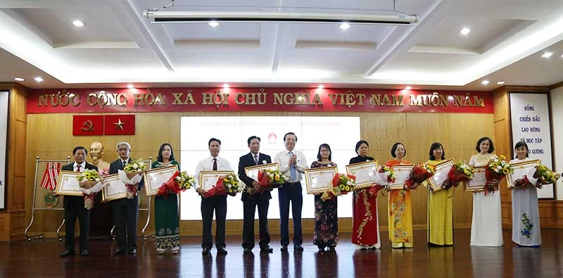 Ông Lê Hồng Sơn, Giám đốc Sở Giáo dục và Đào tạo TP.HCM (giữa), trao tặng danh hiệu Nhà giáo ưu tú cho 21 nhà giáo và cán bộ quản lý giáo dục thuộc các cấp học tại TP. Ảnh: HOÀNG GIANG
