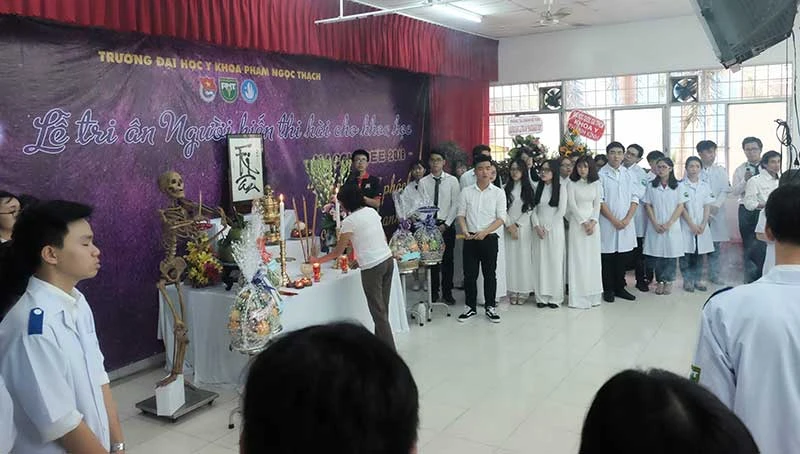 Tại phòng giải phẫu trong khuôn viên Trường ĐH Y khoa Phạm Ngọc Thạch, TP.HCM, dòng người lặng lẽ tri ân những người đã khuất nhưng thân xác còn giúp ích cho đời. Các vết giải phẫu trên thi thể đã được khâu lại cẩn thận, phủ khăn trắng, choàng chuỗi hoa, xếp thẳng hàng.