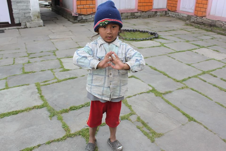Là mấy đứa con nít trên núi Hymalaya- da đen nhẻm, hai gò má nứt nẻ vì nám. Thấy tôi chăm chú nhìn, cậu bé tự động chắp hai bàn tay lên chào to: "Namaste!".