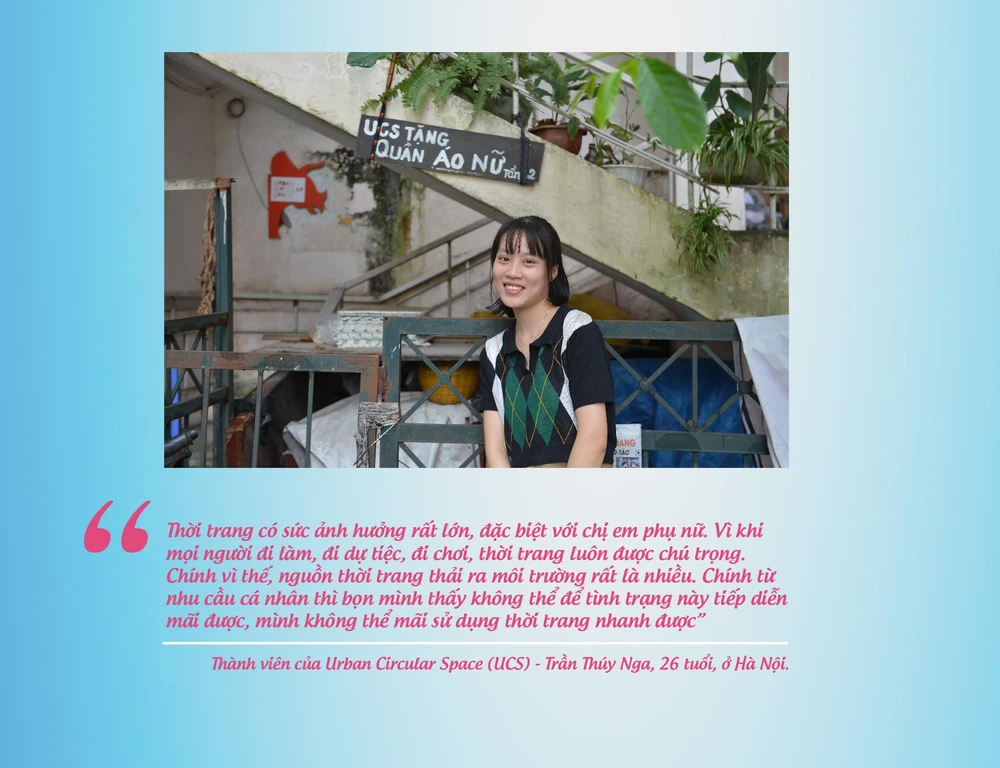 Thúy Nga chia sẻ: “Thời trang có sức ảnh hưởng rất lớn, đặc biệt với chị em phụ nữ. Vì khi mọi người đi làm, đi dự tiệc, đi chơi, thời trang luôn được chú trọng. Chính vì thế, nguồn thời trang thải ra môi trường rất là nhiều. Chính từ nhu cầu cá nhân thì bọn mình thấy không thể để tình trạng này tiếp diễn mãi được, mình không thể mãi sử dụng thời trang nhanh được”.