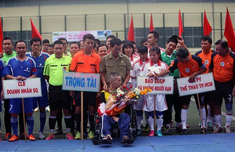 Không “đu” theo thành tích nhưng lại hết lòng với những việc làm giàu tình người. Cả gia đình Trung tâm TDTT quận 1 xắn tay cùng báo Pháp Luật TP.HCM và báo SGGP tổ chức trận cầu từ thiện giúp đỡ nhà báo Minh Hùng. Ảnh: XUÂN HUY