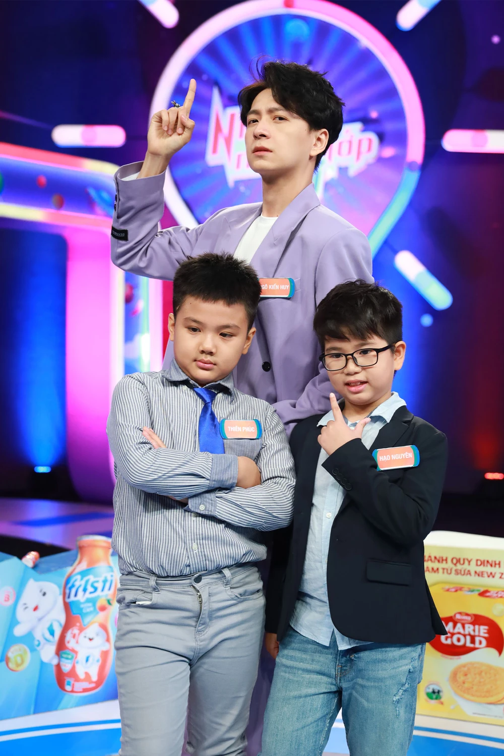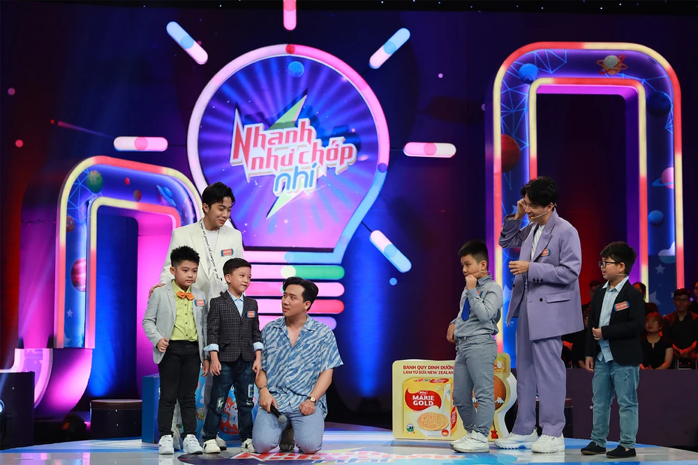 Đầu tiên là sự xuất hiện của nhí Hạo Nguyên (8 tuổi) mà theo như đội trưởng Ngô Kiến Huy bắn pháo bông là: “Trả lời 1.000 câu không sai câu nào” với outfit được MC Trấn Thành ví như doanh nhân thành đạt.