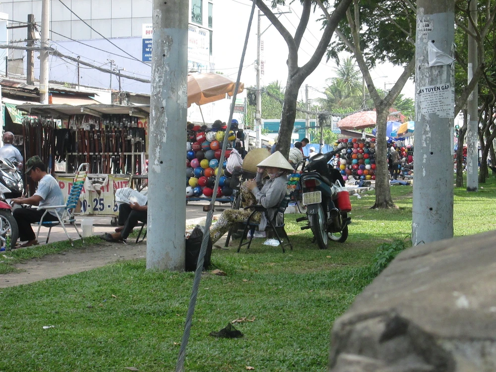 Xung quanh công viên là các quầy hàng rong giày dép, mũ nón, những vật phẩm thông dụng bao vây.