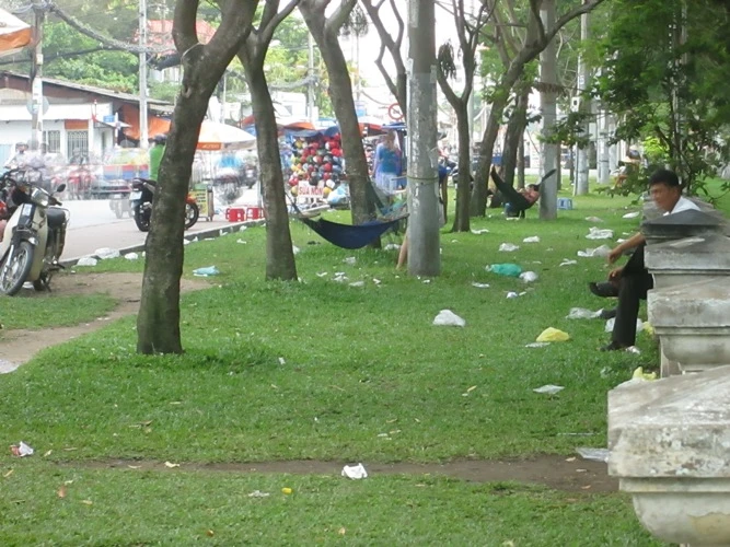 Rác ở khắp nơi. Một số người còn tận dụng bóng mát của cây để thỏa sức với những hoạt động cá nhân đã tạo nên những hình ảnh không hề đẹp trong mắt mọi người.