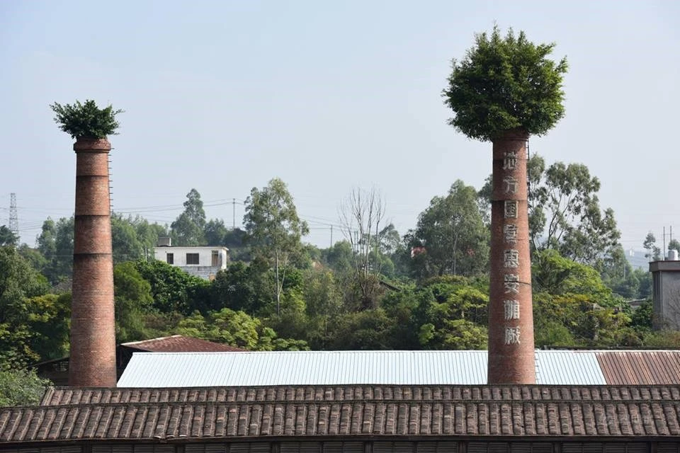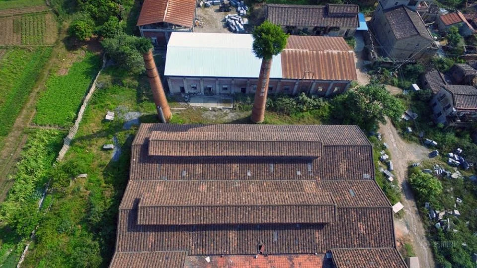 Những ống khói trong một nhà máy sản xuất đường bỏ hoang ở Tuyền Châu, Phúc Kiến (Trung Quốc) đã trở thành chậu cây hết sức đặc biệt. (Nguồn: CCTVNews)