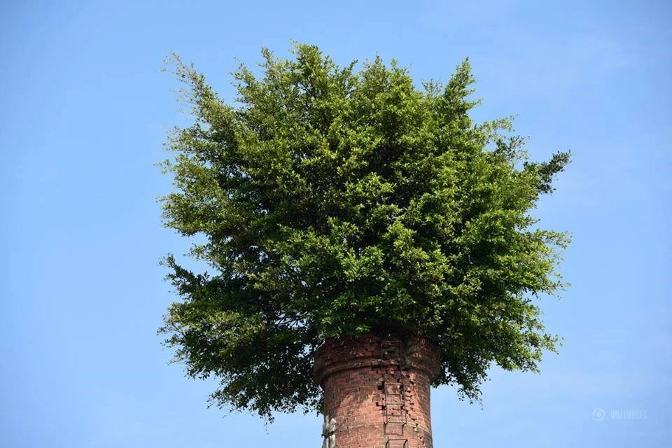 Cây mọc lên từ những lỗ ống khói khiến cho chúng giống như đang đội chiếc mũ màu xanh. (Nguồn: CCTVNews)