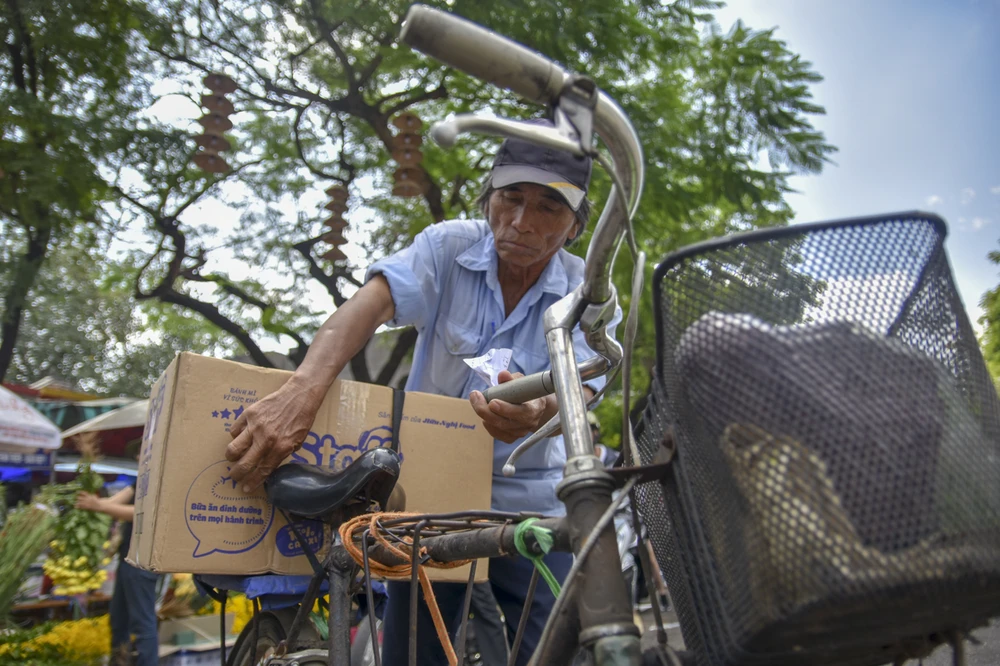 Vì sức khỏe yếu, chở được ích hàng hóa nên xe đạp thồ chủ yếu được người dân thuê đưa một số loại hàng nhỏ nhẹ, đồng nghĩa với việc mỗi cuốc xe chỉ kiếm được vài ngàn đồng hoặc vài chục ngàn đồng tùy theo quãng đường. Ảnh: NGUYỄN DO