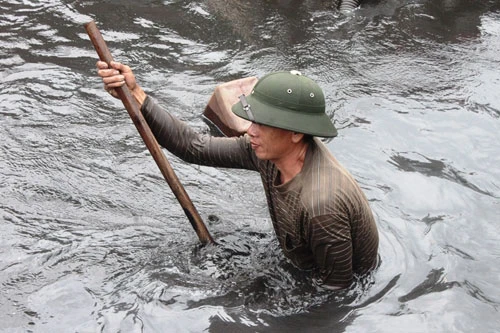 Dù là ở bất cứ dòng kênh nào người ta cũng dễ dàng nhận thấy những phận đời mưu sinh, lầm lũi sau lũ. Đôi vợ chồng này cho biết do quá già không được thuê đãi than nên hai người tìm một chỗ không thuộc đầu nậu quản lý để mót than. Họ cho biết những chiếc rổ, thúng than là kết quả lao động suốt buổi sáng. Ảnh: ĐẶNG TRUNG