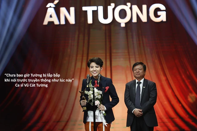 Vũ Cát Tường tỏ ra xúc động và ấp úng khi được xướng tên ở hạng mục Ca sỹ của năm