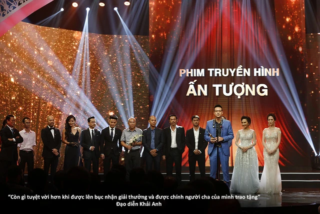 Đạo diễn Khải Anh xúc động trên bục nhận giải khi cùng ê-kip Người phán xử lên nhận giải thưởng Phim truyền hình ấn tượng tại VTV Awards 2017.