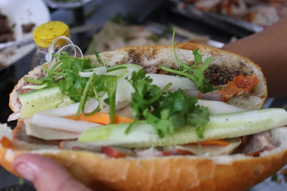 Ổ bánh mì nóng giòn giã được phết lên mặt trong một lớp bơ béo ngậy, một lớp pate thơm phức, sau đó chủ tiệm sẽ cho vào thịt luộc (chế biến với công thức riêng, thịt phải lựa loại cân đối giữa lượng mỡ và nạc với cách ướp vị gia truyền) sau đó là cho chả vào lớp kế trên, một ít đồ chua, hành ngò và cuối cùng là ít tiêu hoặc ớt cho tăng vị hấp dẫn.
