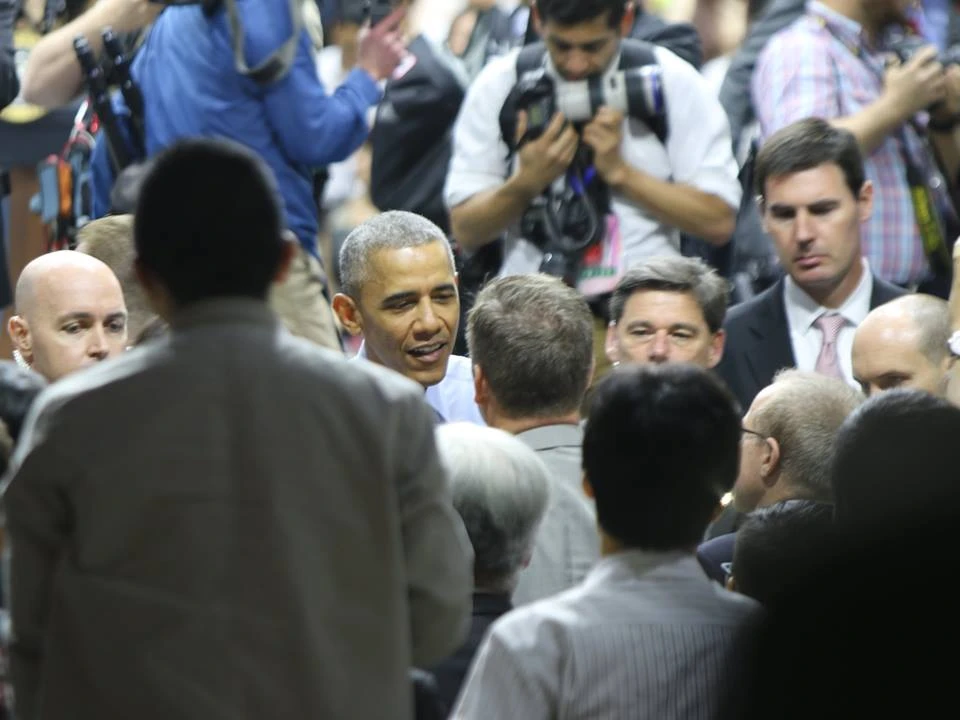 Kết thúc buổi nói chuyện, Tổng thống Obama xuống từng hàng ghế chào hỏi thân tình các khách mời
