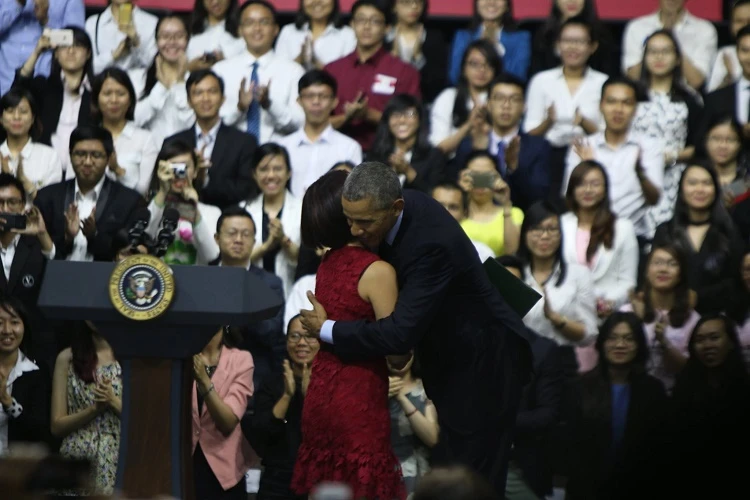 Bước lên sân khấu trò chuyện với hơn 800 thanh niên ưu tú, Tổng thống Obama đã có những cử chỉ rất thân thiện và tình cảm