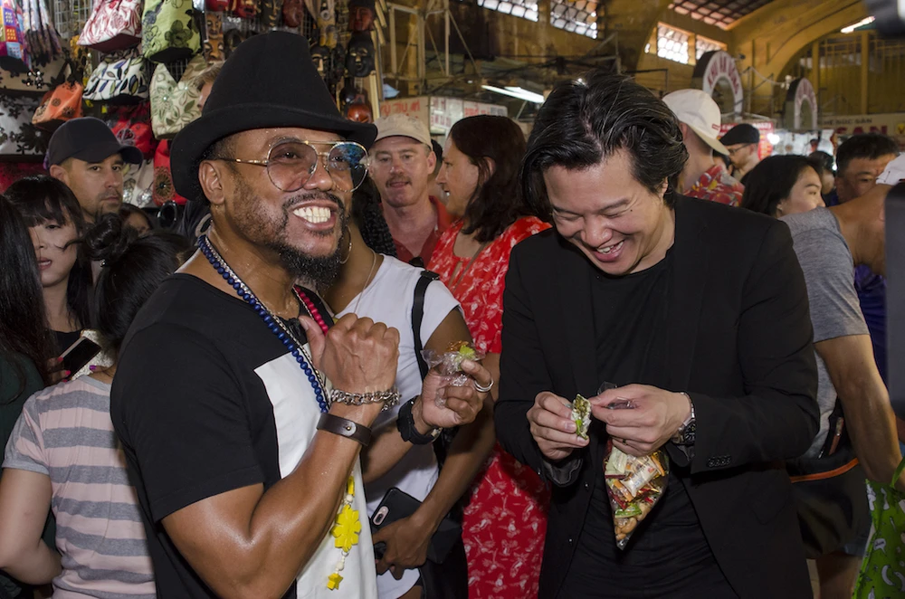Gương mặt nổi bật nhất tại New Year’s Countdown LIGHTS 2018 là ca sĩ, nhạc sĩ, rapper, nhà sản xuất âm nhạc Apl De Ap. Trong ảnh: Apl De Ap và ca sĩ Thanh Bùi tại chợ Bến Thành. Ảnh: Amberstone cung cấp
