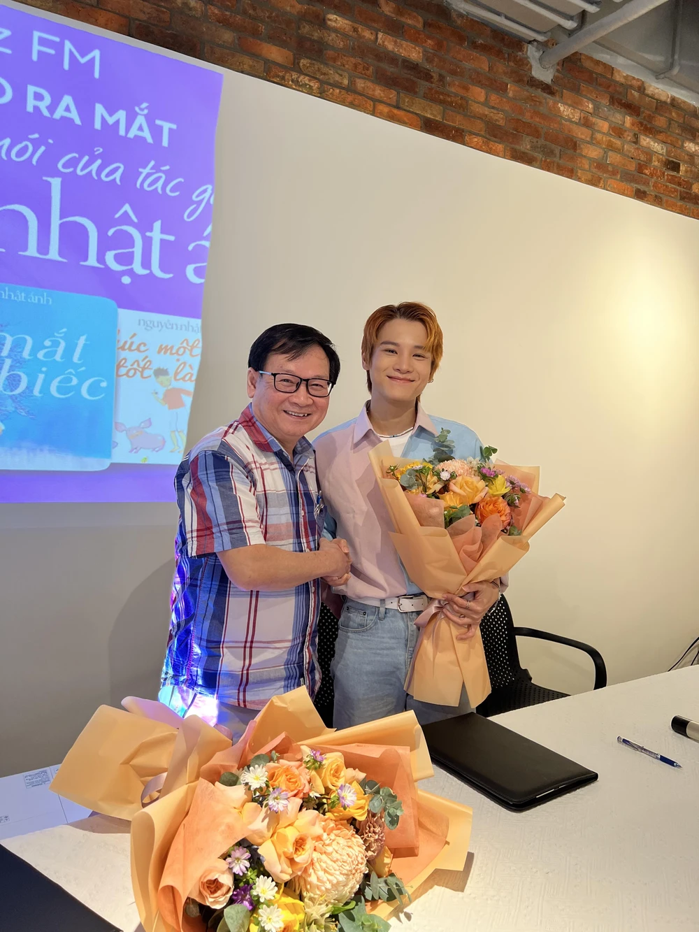 Ca sĩ Phạm Đình Thái Ngân xúc động khi được làm việc cùng nhà văn Nguyễn Nhật Ánh. Anh cũng chính là người đã lồng tiếng cho nhân vật Ngạn trong phim điện ảnh cùng tên. Ảnh: CTV