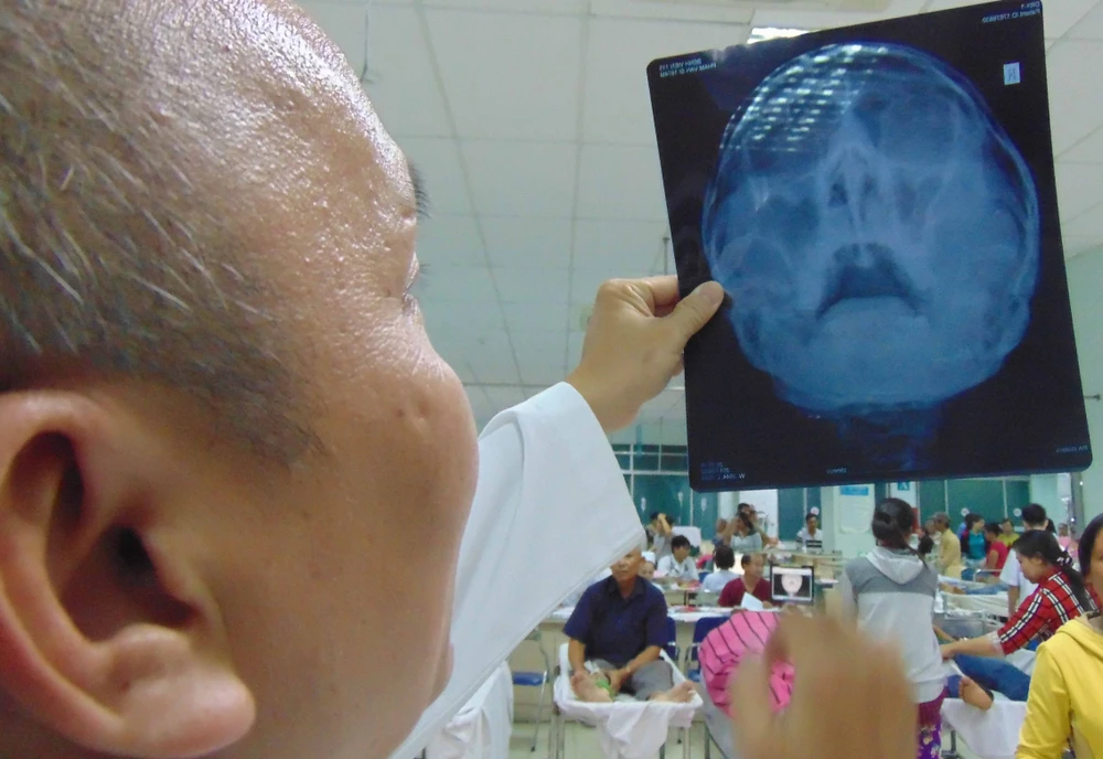 Bác sĩ Lê Hồng Hải đang xem kết quả chụp X quang của công S. Ảnh: TRẦN NGỌC