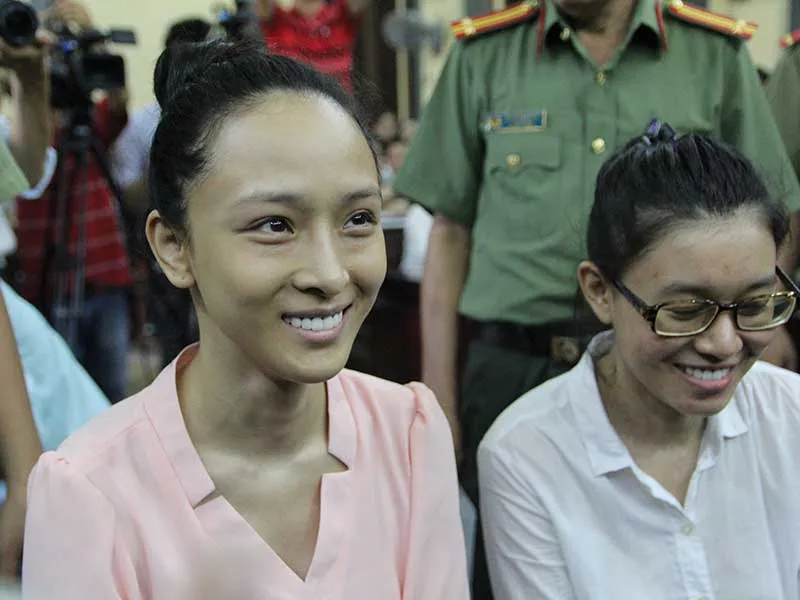 Trương Hồ Phương Nga và Nguyễn Đức Thùy Dung tươi cười nghe chủ tọa công bố quyết định tại ngoại. Ảnh: HOÀNG GIANG