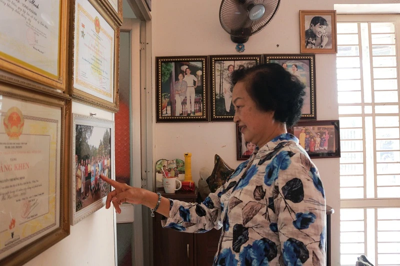 Bà Hai Minh bên những bức ảnh kỉ niệm của gia đình mình, những tấm bằng khen lúc còn tham gia kháng chiến và sau khi giải phóng. Ảnh: THANH TUYỀN.