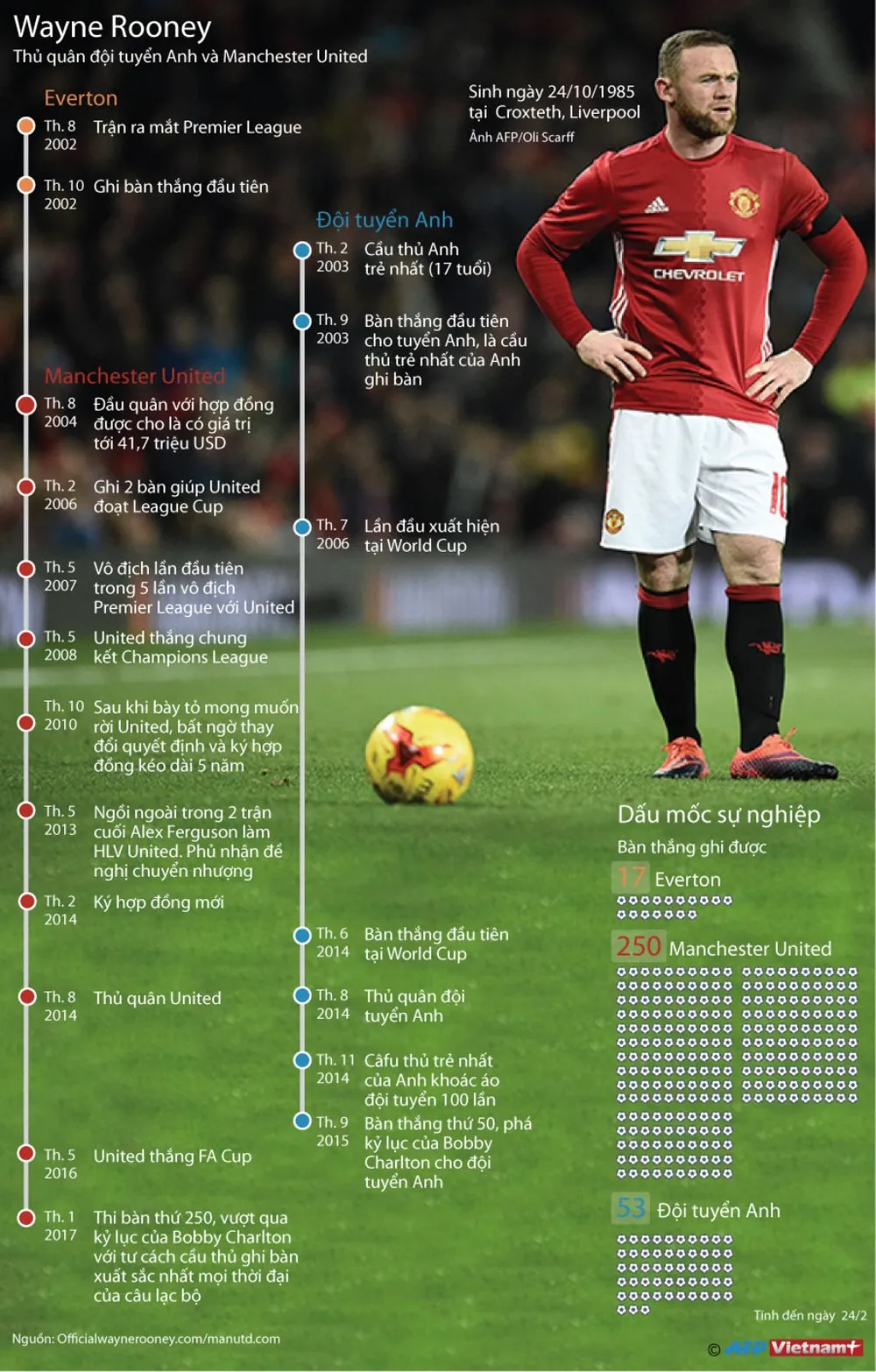 Cụ thể, Rooney đã có được tổng cộng 250 bàn thắng sau 546 trận trong màu áo Manchester United, vượt qua cột mốc ghi bàn của huyền thoại Sir Bobby Charlton.