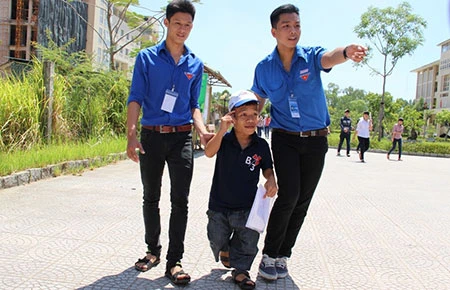 “Cậu bé tí hon” Nguyễn Minh Vượng được các tình nguyện viên đưa vào phòng thi sáng 4-7. Ảnh: V.LONG