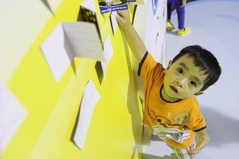 Một em nhỏ với tay dán tấm thiệp “Chúc mọi người trung thu ấm áp” tại Phố lồng đền Phú Mỹ Hưng tối 25-9 - Ảnh: HOÀNG GIANG