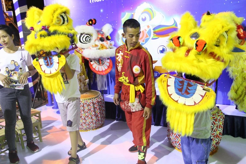 Các em nhỏ vào vai những ông lân nhảy múa trong ngày trung thu - Ảnh: HOÀNG GIANG