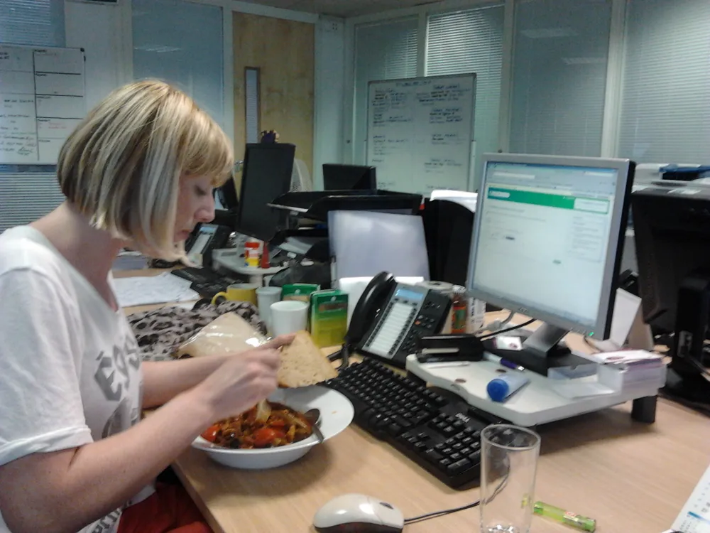 Theo một nghiên cứu của Right Management, 65% người Mỹ ăn trưa tại bàn làm việc, dẫn đến ngồi nhiều và ít tương tác xã hội.