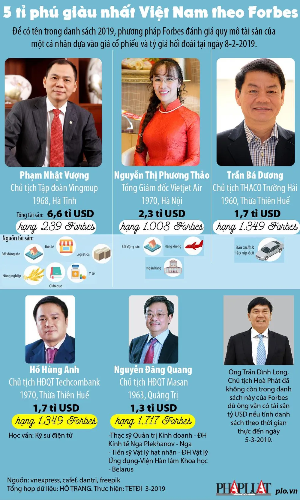 (PLO)- Năm nay, Việt Nam có thêm 2 tỷ phú mới trong danh sách Forbes 2019 là Chủ tịch Masan - Nguyễn Đăng Quang và Chủ tịch Techcombank - Hồ Hùng Anh. Ông Trần Đình Long, Chủ tịch Hoà Phát đã không còn trong danh sách này dù vẫn có tài sản tỉ USD...