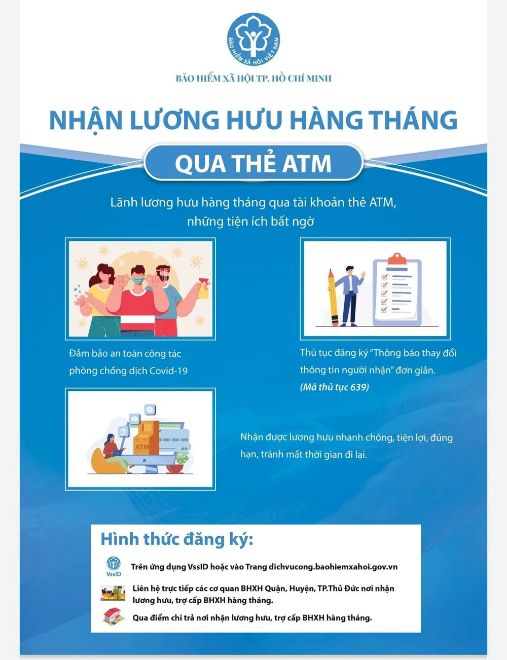 Từ những tiện ích trên, cơ quan BHXH TP.HCM hướng dẫn người hưởng muốn đăng ký nhận lương hưu, trợ cấp BHXH hàng tháng thông qua hình thức tài khoản ngân hàng thay cho việc nhận bằng tiền mặt thì đến tại các điểm chi trả thuộc hệ thống bưu điện hoặc liên hệ với BHXH thành phố Thủ Đức và quận, huyện để được hỗ trợ. Người dân cũng có thể đăng ký qua ứng dụng VssID hoặc vào trang dichvucong.baohiemxahoi.gov.vn.