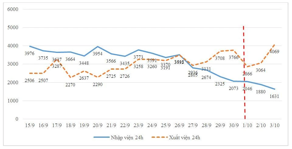 - Về số ca nhập viện và xuất viện tại các cơ sở điều trị: Số ca nhập viện mới từ ngày 1-10 vẫn trên đà giảm, trong khi số xuất viện mỗi ngày tại các bệnh viện vẫn đang tăng lên (hình 2):