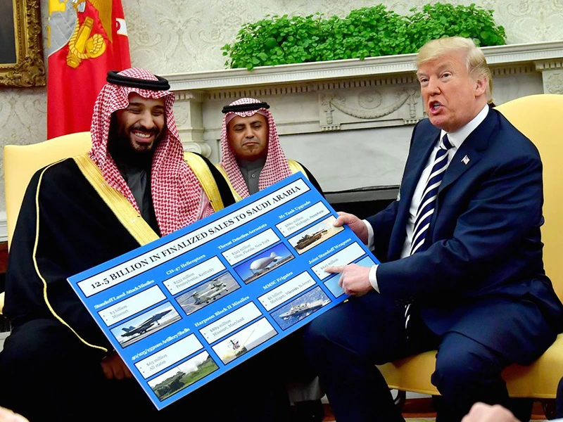 Tổng thống Mỹ Donald Trump (phải) tiếp thái tử Mohammed bin Salman đến thăm Nhà Trắng hồi tháng 3. Trong tay ông Trump là thông tin thỏa thuận mua bán vũ khí giữa Mỹ với Saudi Arabia. Ảnh: GETTY IMAGES