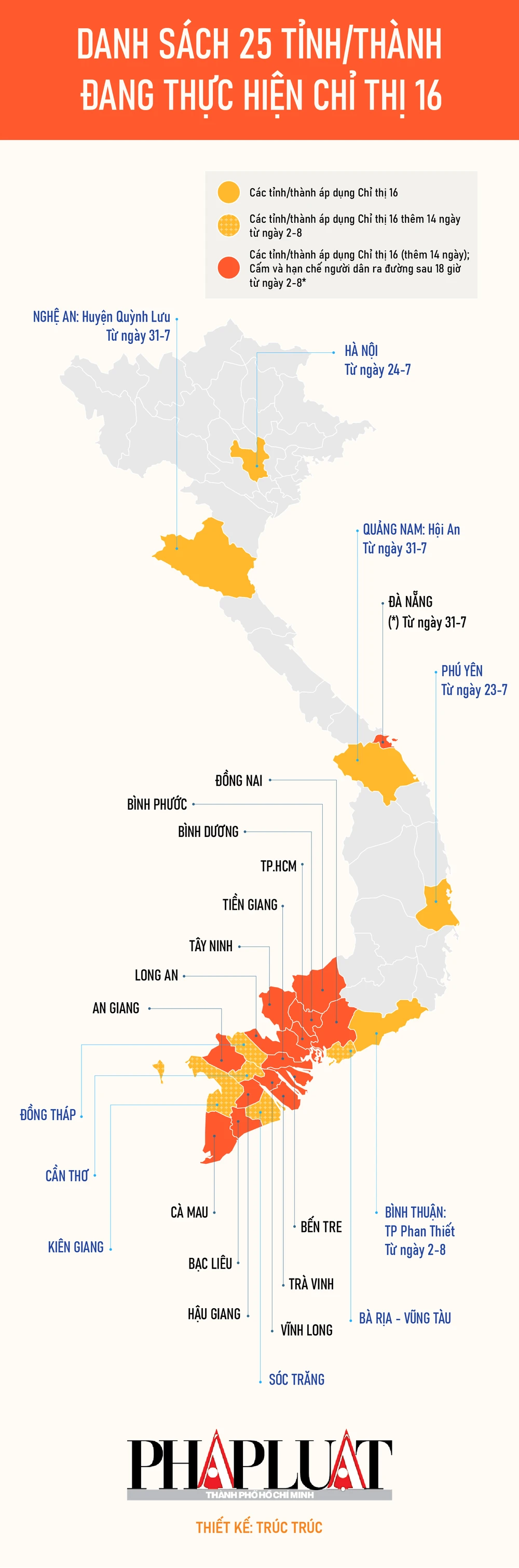 (PLO)- Thực hiện yêu cầu của Thủ tướng chính phủ tại Công điện 1063 ngày 31-7, nhiều tỉnh thành đã gia hạn thời gian thực hiện Chỉ thị 16 thêm 14 ngày. Một số tỉnh thành cũng nâng mức cao hơn về giãn cách xã hội để phòng, chống dịch COVID-19.