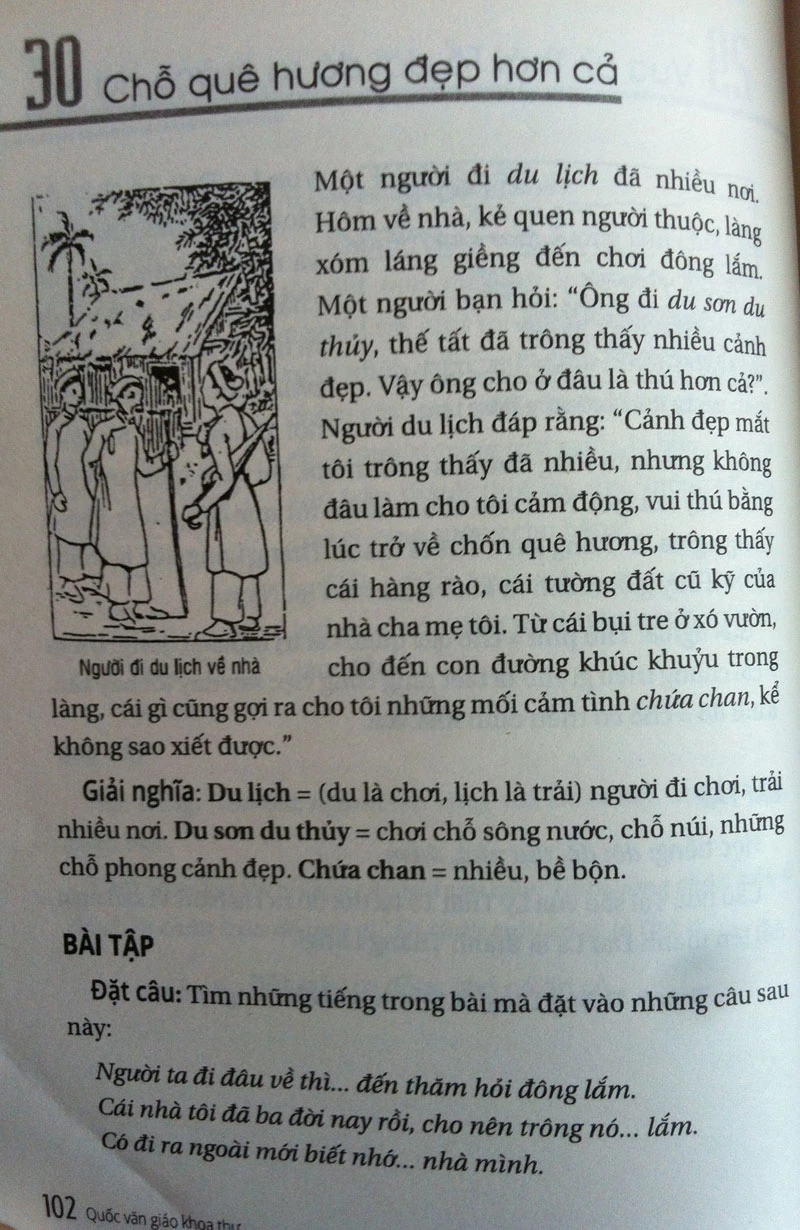 Ông trích lại một đoạn truyện "Chốn quê hương đẹp hơn cả" trong Quốc văn giáo khoa thư: “…Một người đi du lịch đã nhiều nơi. Hôm về nhà, kẻ quen người thuộc làng xóm, láng giềng đến chơi đông lắm. Một người bạn hỏi ông: ông đi du sơn du thủy…