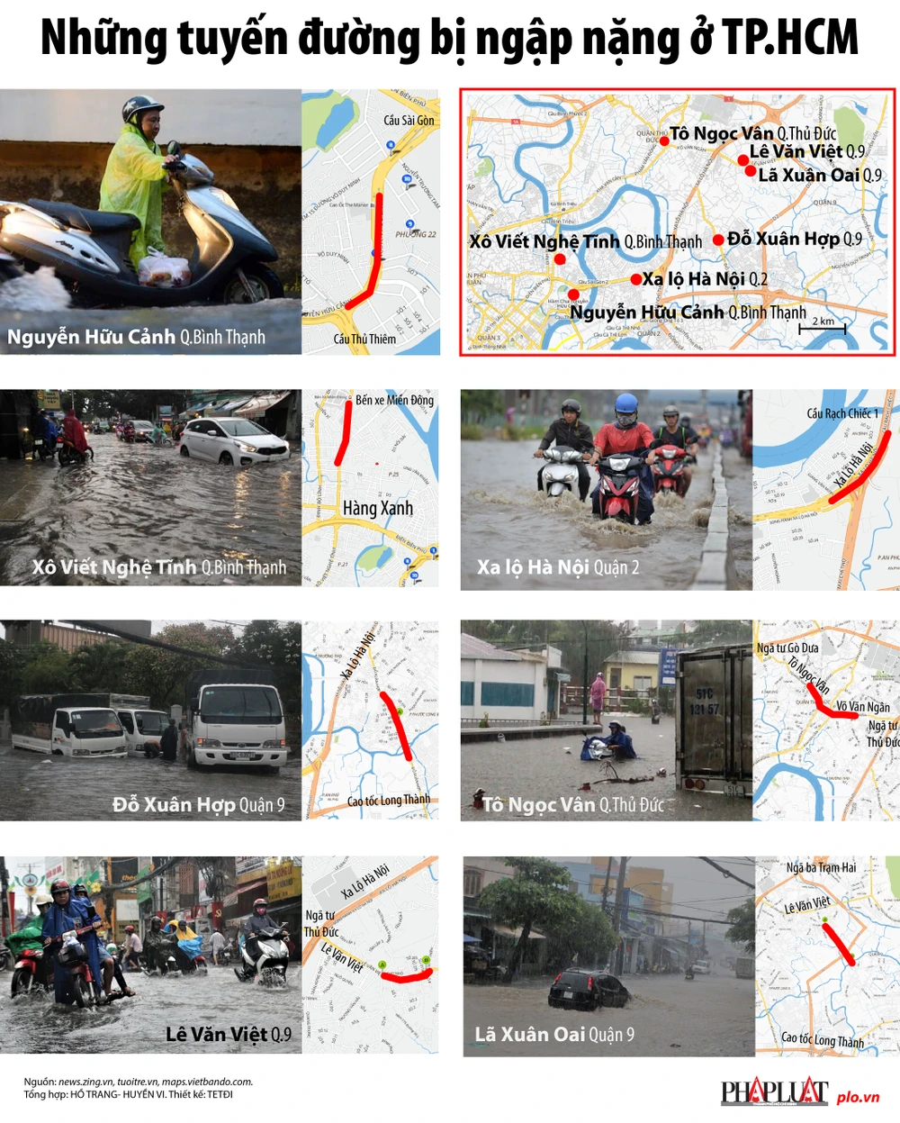 (PLO) - Sau những trận mưa đầu mùa, nhiều tuyến đường ở TP.HCM bị ngập nặng. Người tham gia giao thông khổ sở khi đi qua những tuyến đường này. Cùng điểm lại những tuyến đường bị ngập nặng ở TP.HCM.