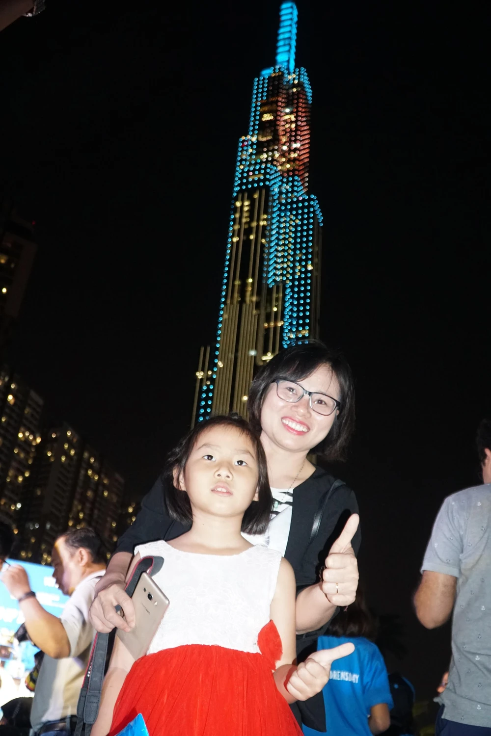 Người tham dự thích thú với tòa nhà Landmark 81 nhuộm xanh. Ảnh: HL