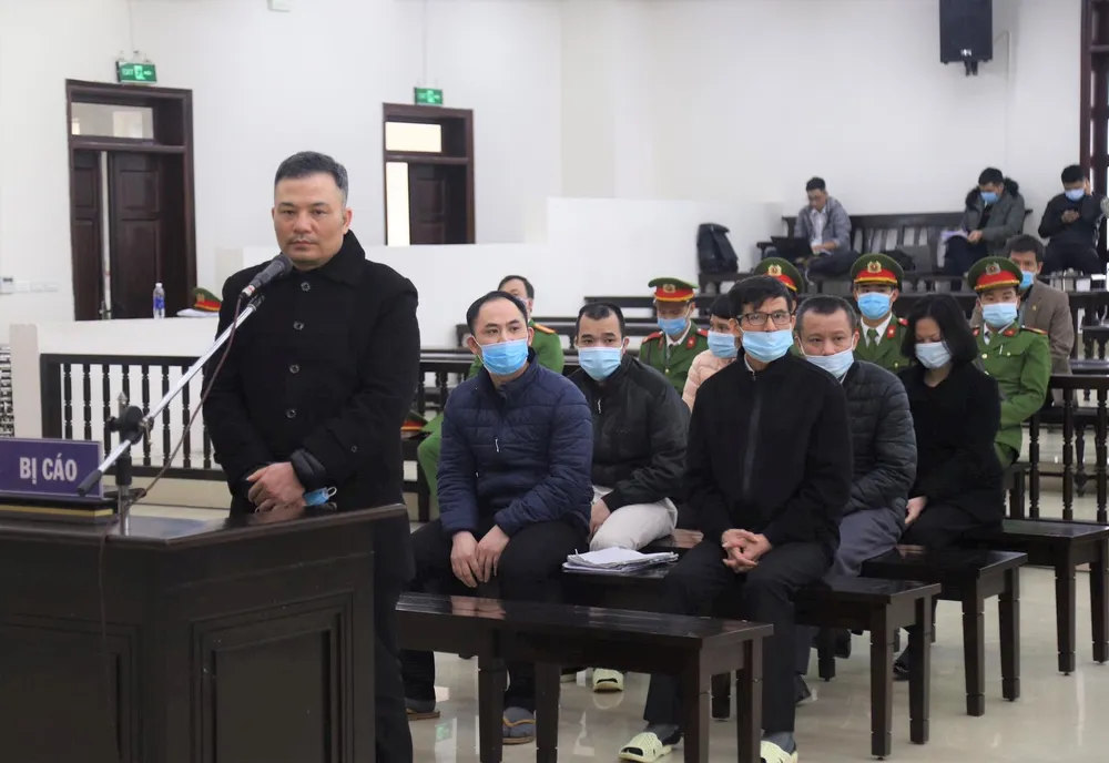 Lê Xuân Giang (đứng) cùng các đồng phạm tại tòa chiều 22-12