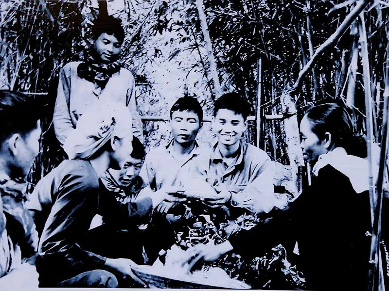 Đồng bào trong ấp chiến lược ra tiếp tế lương thực cho bộ đội Tiểu đoàn Quyết Thắng bám trận địa năm 1967. Ảnh: TƯ LIỆU