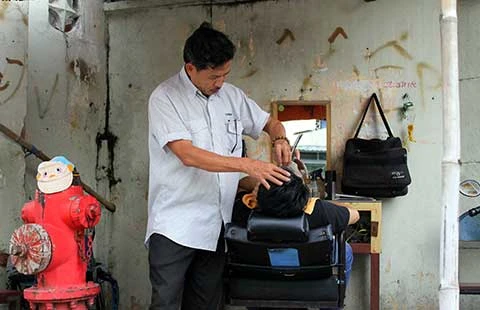 Khi tiếng gõ mõ tụng hồi kinh đầu ngày vang lên, ông ở đó giăng tấm bạt đơn sơ, treo lủng lẳng một chiếc gương, hai cây kéo và một cái tông đơ, cặm cụi làm công việc hớt tóc cho người lao động nghèo.