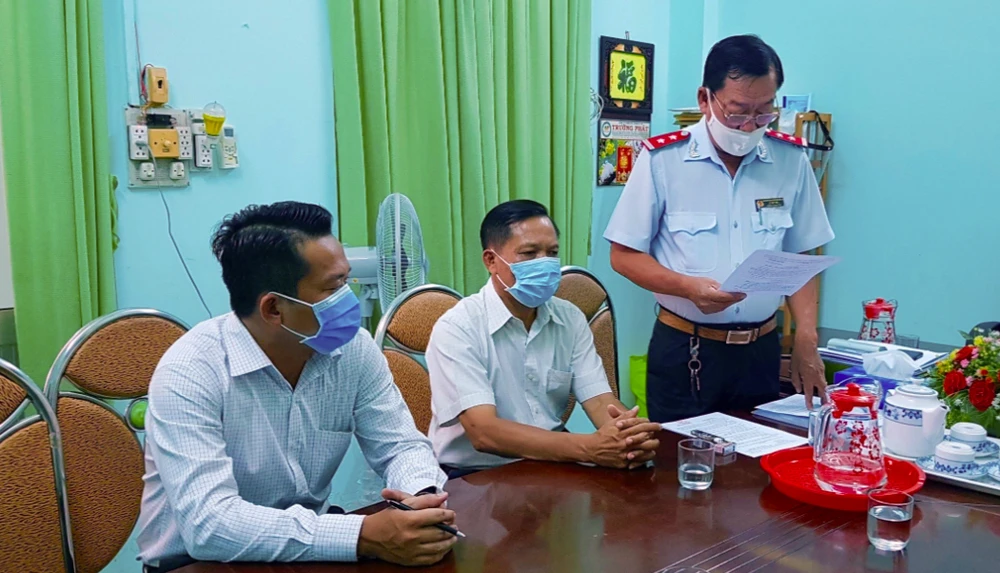 Thanh tra Sở TT&TT tỉnh Kiên Giang đọc quyết định xử phạt vi phạm hành chính đối với ông Dương Hồng H. tại UBND phường Vĩnh Lạc. Ảnh: kiengiang.gov.vn
