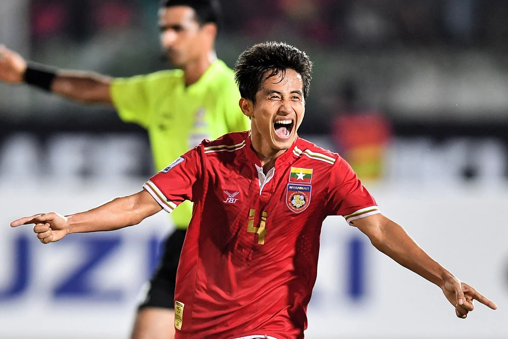 David Htan ghi bàn duy nhất giúp Myanmar đánh bại Malaysia (mặc đồ Nike).