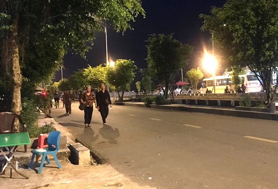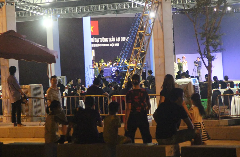 Khoảng 20 giờ, các đoàn đến viếng Chủ tịch nước Trần Đại Quang vẫn tiếp tục. Ở bên ngoài, những em thiếu nhi được mẹ đưa đến lễ viếng đang lặng lẽ nghe tiếng nhạc vang lên mỗi khi có đoàn đến viếng. Ảnh: Đ.TRUNG
