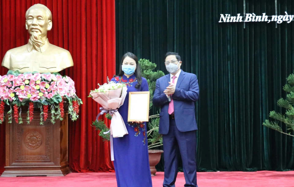 Trưởng ban Tổ chức Trung ương Phạm Minh Chính trao quyết định cho bà Nguyễn Thị Thu Hà giữ chức bí thư Tỉnh ủy Ninh Bình. Ảnh: Đ.PHƯƠNG