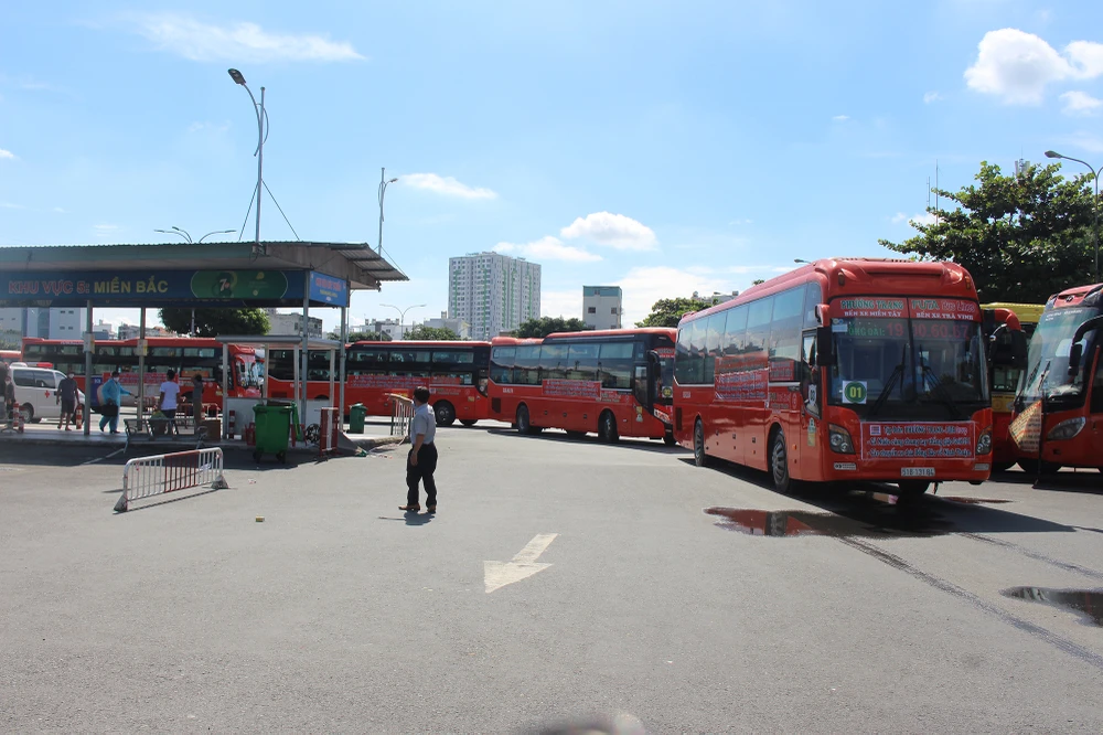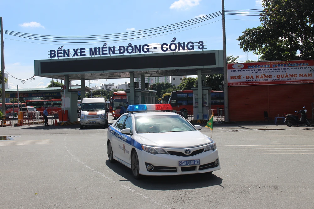 Từ khoảng 7 giờ sáng, tại cổng 3 bến xe miền Đông, lực lượng chức năng tỉnh Ninh Thuận đã bố trí lực lượng trực cổng, kiểm tra giấy tờ và hướng dẫn công dân làm thủ tục trước khi xuất bến.