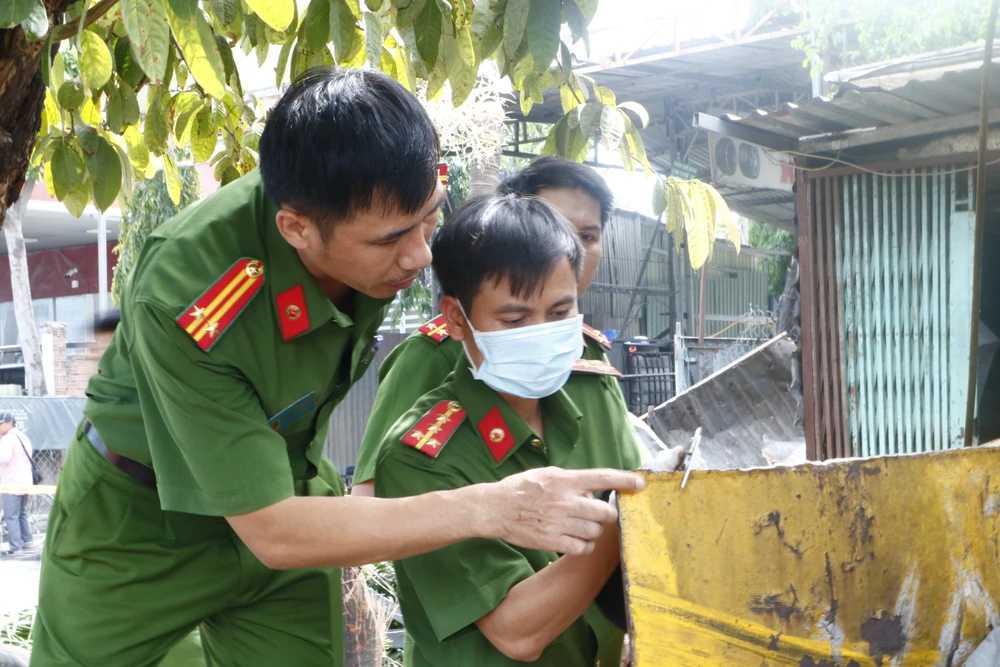 Lực lượng công an khám nghiệm hiện trường vụ nổ. Ảnh: LÊ ÁNH