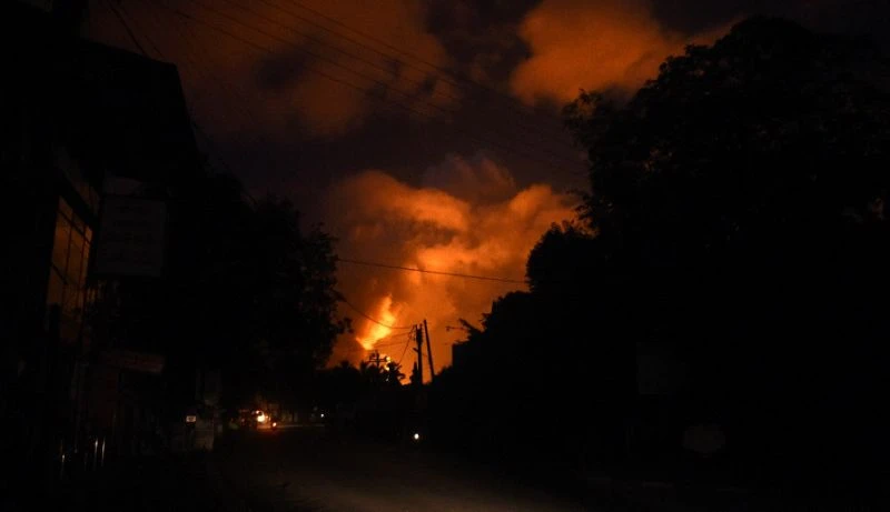 Bầu trời đêm tại Salawa, Sri Lanka tối 5-6 sáng rực với quầng lửa màu cam khi các vụ nổ lớn xảy ra liên tiếp. Ảnh: AFP