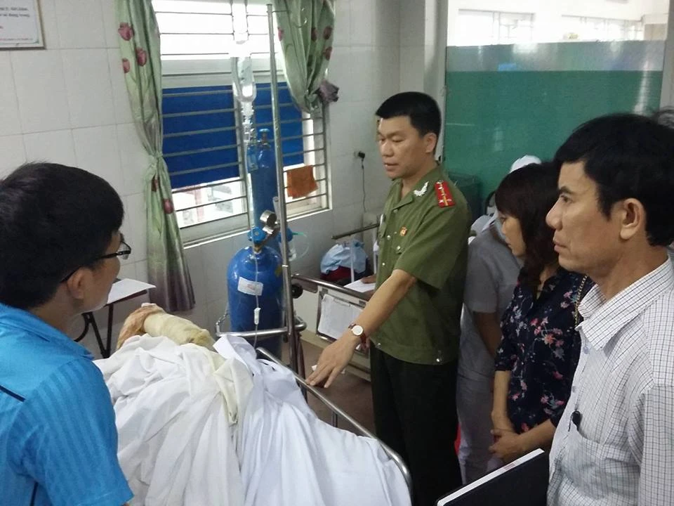 Bà Trần Thị Ánh Tuyết - phó chủ tịch UBND huyện Nghi Lộc đến bệnh viện thăm hỏi động viên các công nhân bị thương nặng. Trong ành, chị Nguyễn Thị Lan sinh năm 1968 bị bỏng cháy khắp cơ thể đang phải nằm úp.