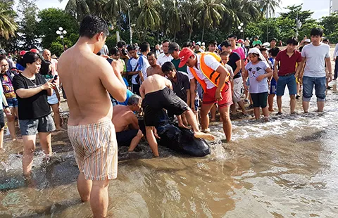 Mọi người đang nỗ lực đưa cá trở lại biển. Ảnh: LỘC THU