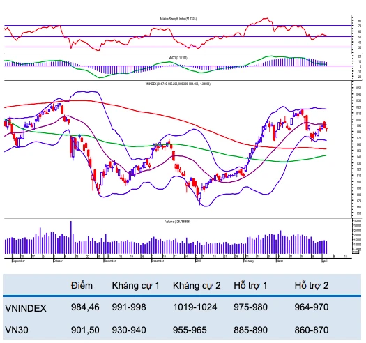 Trên góc nhìn kỹ thuật, tín hiệu kỹ thuật ngắn hạn của VN-Index, VNMidcap vẫn được giữ ở mức trung tính với kháng cự MA20 tại 992 điểm và 1.010 điểm, ghi nhận từ Chứng khoán Bản Việt (VCSC). Trong khi đó, tín hiệu của VN30 và HNX-Index tiếp tục ở mức tiêu cực dù các hỗ trợ trung hạn chưa bị vi phạm.