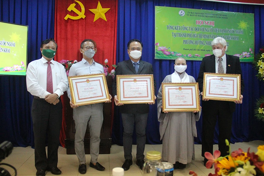 Ông Phùng Công Dũng, Chủ nhiệm Ủy ban về người Việt Nam ở nước ngoài TP.HCM, trao bằng khen của UBND TP.HCM cho cá nhân, tổ chức có thành tích xuất sắc. Ảnh: LÊ THOA