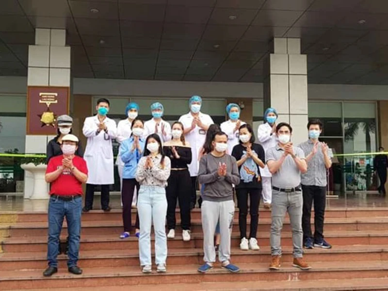 Các bệnh nhân được công bố khỏi bệnh tại BV Bệnh nhiệt đới trung ương chiều 7-4. Ảnh: XP